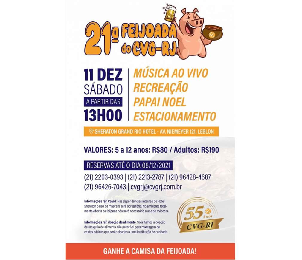 Por causa da pandemia, pela primeira vez em duas décadas, a Feijoada do CVG-RJ não foi realizada, em 2020. Mas agora, com o avanço da vacinação, o evento será retomado com os cuidados necessários: na parte interna do hotel, ainda será obrigatório o uso de máscara, que está dispensada para a área externa, local da Feijoada, seguindo orientação da Prefeitura do Rio.
