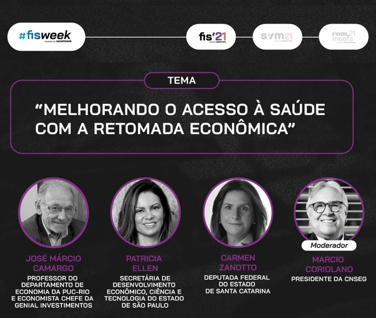 Um dos últimos painéis do FIS 21, encerrado nesta sexta-feira (12) e promovido pela Iniciativa FIS, reuniu o Presidente da Confederação Nacional das Seguradoras - CNseg, Marcio Coriolano; o professor do Departamento de Economia da PUC-Rio, José Marcio Camargo; a secretária de Desenvolvimento Econômico, Ciência e Tecnologia do Estado de São Paulo, Patricia Ellen, e a deputada federal Carmen Zanotto (Cidadania- SC).