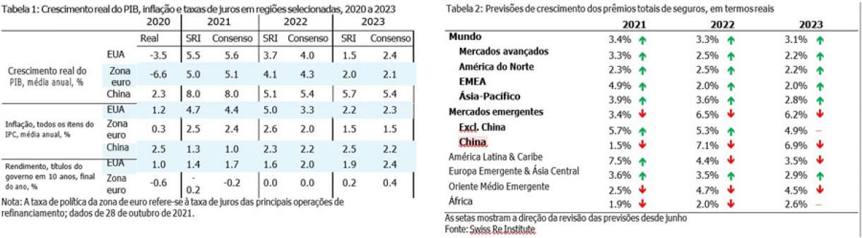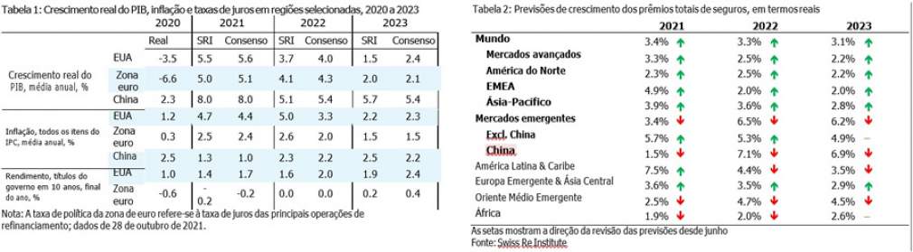 O estudo sigma do Swiss Re Institute prevê que o crescimento do PIB global será forte em 2021, em 5,6%, diminuindo para 4,1% em 2022 e 3,0% em 2023. A inflação é o risco macroeconômico prevalecente a curto prazo, alimentada pela crise energética e por questões prolongadas do lado da oferta. Espera-se que a pressão de preços seja mais aguda entre os mercados emergentes e no Reino Unido e nos EUA.