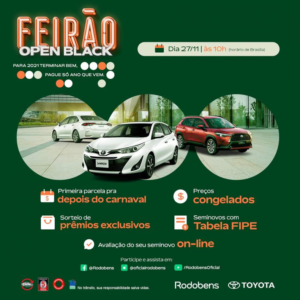 Neste sábado, 27 de novembro, a partir das 10h, a Rodobens, que possui um amplo portfólio de serviços financeiros suportados por uma plataforma sinérgica de rede de concessionárias próprias de automóveis e veículos comerciais, entra no clima da Black Friday e realiza o Feirão Open Black, com ofertas especiais para automóveis da marca Toyota, como os modelos Corolla Cross e Corolla Sedan.