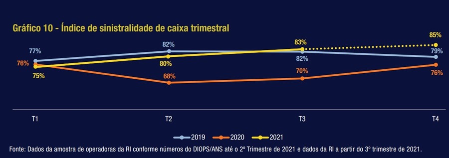 Ainda segundo a ANS, a sinistralidade no 3º Tri de 2021 ficou em 83%, oito pontos percentuais maior que no primeiro trimestre do ano, que foi de 75%. Considerada a projeção feita pela agência reguladora, o quarto trimestre é ainda mais preocupante: as operadoras podem encerrar 2021 com 85% de sinistralidade, dez pontos percentuais a mais que o apresentado no começo do ano.