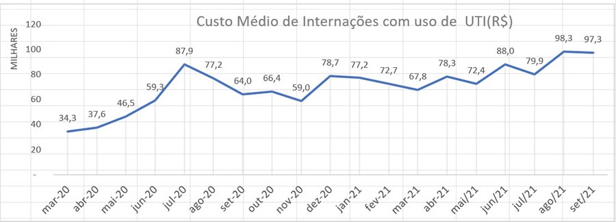 Os custos por internação Covid-19 (UTI), em setembro/20, estavam em R﹩ 63.966 em média, por paciente. Após um ano, esse número saltou para R﹩ 97.328, valor 52,2% a mais. Em relação a agosto/21, os valores de setembro/21 se mostram estáveis, porém, a estabilidade se dá em níveis muito altos.