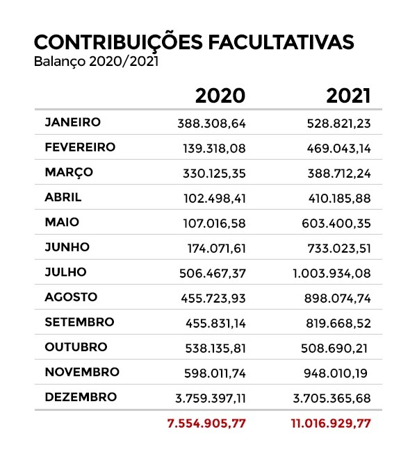 As contribuições voluntárias dos participantes da Fundação de Previdência Complementar do Estado de São Paulo (Prevcom) totalizaram R$ 11,01 milhões em 2021 com crescimento de 45,8% em relação aos R$ 7,55 milhões realizados no ano anterior. O resultado anual foi alcançado com a entrada de R$ 3,70 milhões em dezembro, impulsionada principalmente pelo reforço de caixa do 13º salário.