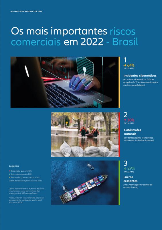 Pelo segundo ano consecutivo os riscos cibernéticos aparecem como principal preocupação para as empresas brasileiras, de acordo com o 11º Allianz Risk Barometer. Cerca de 64% dos respondentes consideram essa a maior ameaça para os negócios, seguido das catástrofes naturais (30%) e a interrupção de negócios (29%).