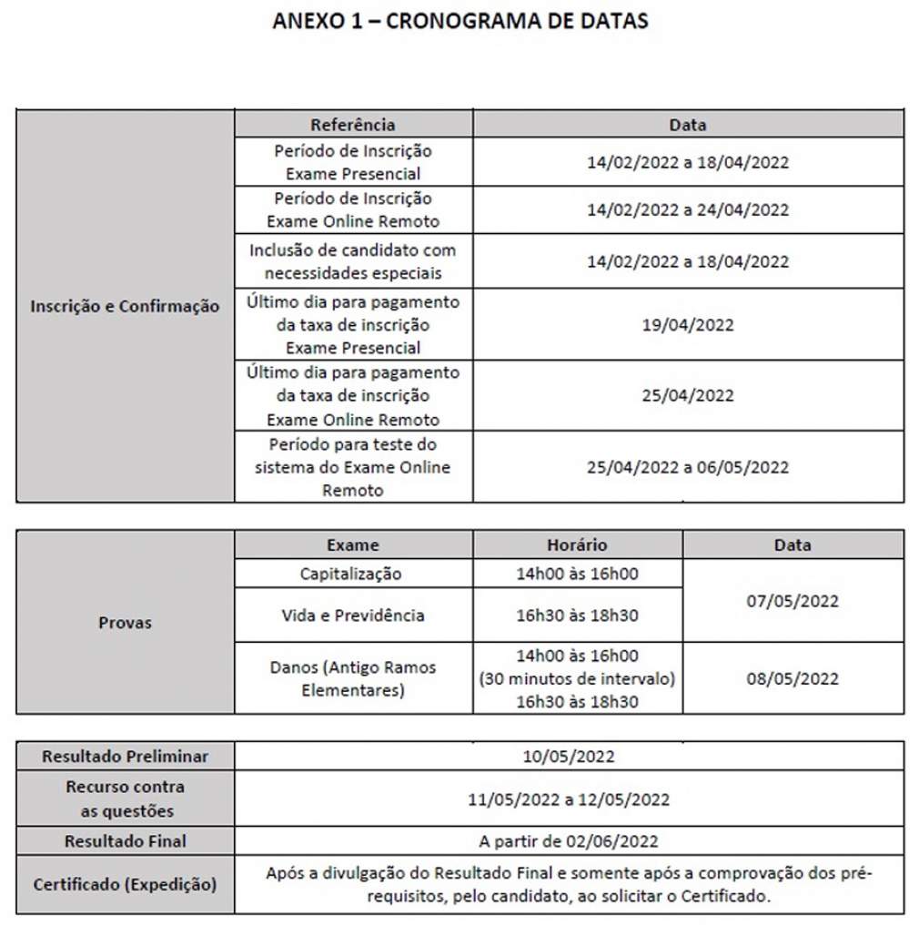 A prova para o segmento de Capitalização será em 7 de maio, das 14h às 16h; para o de Vida e Previdência, a data também é 7 de maio, das 16h30 às 18h30. Já as provas para a área de Danos (antigo "Ramos Elementares”) ocorrem no dia 8 de maio, das 14h às 18h30, com intervalo de 30 minutos a partir das 16h.