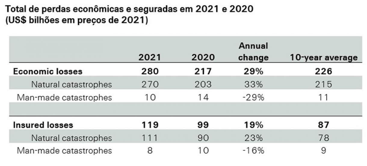 No ano passado, as catástrofes naturais resultaram em uma perda econômica global total de US$ 270 bilhões e perdas seguradas de US$ 111 bilhões -- a quarta maior nos registros sigma. O dado mostra tendência contínua de longo prazo de perdas seguradas, aumentando entre 5% e 7% ao ano em todo o mundo. Embora o furacão Ida tenha sido o desastre natural mais caro em 2021, os eventos secundários mais uma vez foram responsáveis pela maioria das perdas seguradas por catástrofes naturais ao longo do ano. A inundação na Europa em julho, por exemplo, foi o desastre natural mais caro já registrado na região. Apesar das perdas seguradas recorde de inundações, a lacuna de proteção global associada continua grande.