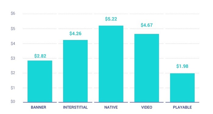 O dado que mais surpreende no levantamento está relacionado ao preço dos anúncios para jogos. Existem cinco formatos de anúncios para esse setor e, de todos eles, os anúncios interativos são os que têm o menor custo por instalação, chegando a US$1,98, bem abaixo da média de US$3,79 de todos os cinco formatos de anúncio para jogos, tornando-o o mais atraente para os profissionais de marketing deste nicho. Os demais formatos (banner, intersticial, nativo e vídeo) têm um CPI conforme a imagem abaixo: