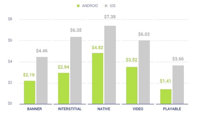 Relatório mostra que o Android possui um CPI mais baixo do que o iOS, com anúncios interativos alcançando o valor máximo (US$ 1,98) em todos os formatos de jogos