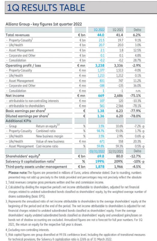 1T 2022: O PVNBP4 ou valor atual dos prêmios dos novos negócios permaneceu estável em 19,4 (19,5) bilhões de euros. A Alemanha registrou menores volumes de venda para produtos capital-eficientes, ao passo que a Itália teve menos vendas de produtos do tipo unit-linked. Essa diferença foi em grande parte compensada por vendas maiores de produtos de renda vitalícia a índice fixo nos Estados Unidos e de produtos híbridos na França.