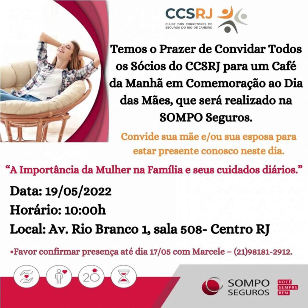 A participação é franqueada a todos os sócios do CCS-RJ - mulheres e homens -, com direito a acompanhante, mãe ou esposa. A palestra “A importância da mulher na família e seus cuidados diários” será proferida por Fabiane Freitas, psicóloga, coach e executiva de contas da Filial Corporate da SOMPO no Rio de Janeiro, durante um delicioso café da manhã oferecido pela companhia.