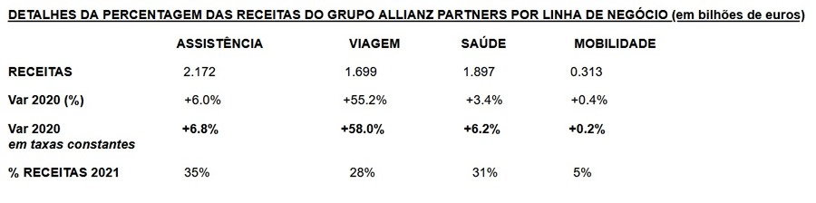 Todas as linhas de negócios do Grupo Allianz Partners obtiveram desempenho melhor em 2021 em comparação com 2020, à medida que a economia global se recupera após as restrições mais severas da pandemia de Covid-19. O segmento de viagens apresentou a maior recuperação, principalmente devido à rápida retomada do mercado de viagens dos EUA. A linha de assistência também apresentou um crescimento positivo, principalmente no segmento de Assistência Residencial e Auto.