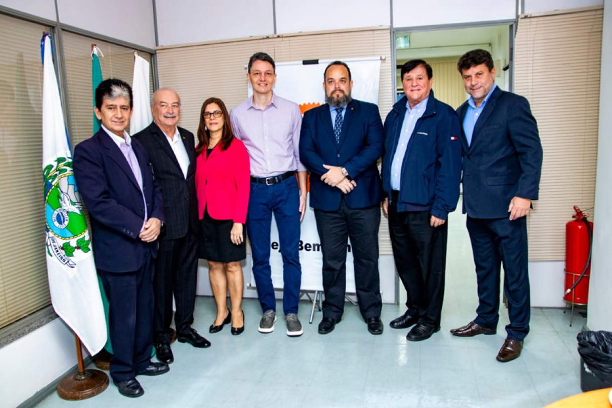 Da esquerda para direita: Wellington Costa (diretor social); Enio Miraglia (vice-presidente); Sonia Marra (diretora adjunta de ensino); Rafael Rosas (WinSocial/MAG); Vinicius Brandão (diretor adjunto social); Gilberto Villela (diretor financeiro) e o presidente Octávio Perissé – Foto: Dalvino Santino