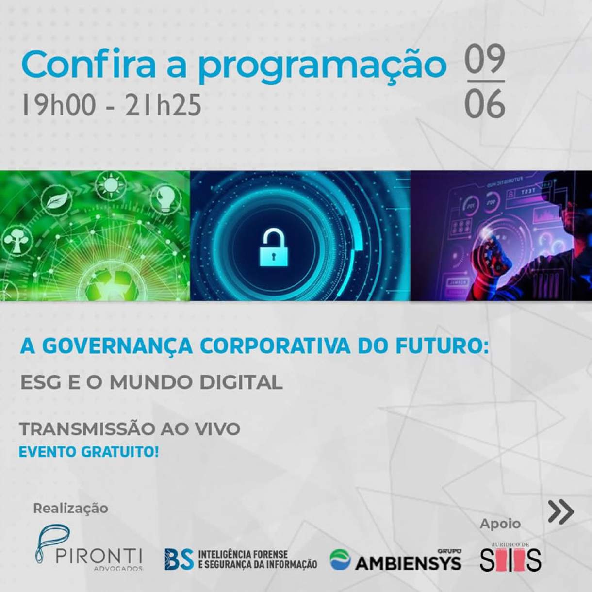 Gratuito e com transmissão online, o evento "Governança Corporativa do Futuro, ESG e mundo digital" acontece nesta quinta-feira (09)