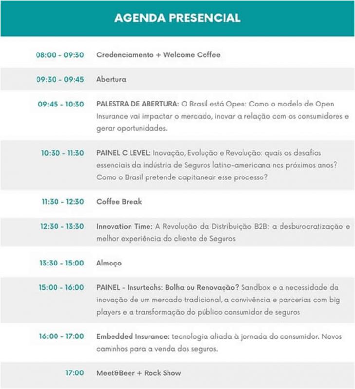 - FIELDTRIP - dias 11 e 12 de agosto: a melhor viagem de campo da história do seguro na América Latina com visitas aos Inovabra (Host: Bradesco Seguros), Oxigênio (Host: Porto Seguro), Mattos Filho (Host: Mattos Filho) e muitas outras surpresas!