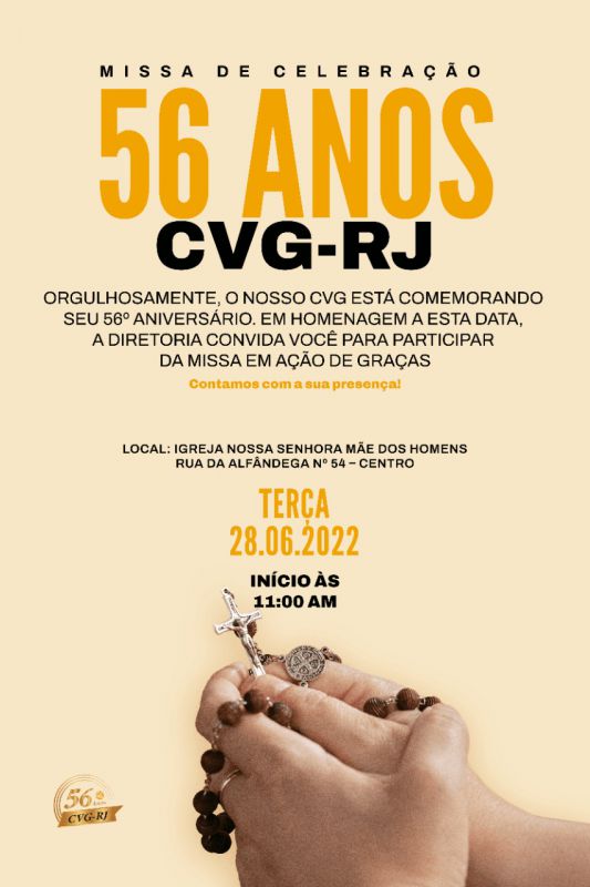 A diretoria do CVG-RJ convida os seus associados, conselheiros, entidades parceiras, profissionais do mercado e amigos para a missa em ação de graças pelos 56 anos de fundação do CVG-RJ, que será celebrada no dia 28 de junho, às 11 horas, na Igreja Nossa Senhora Mãe dos Homens, na Rua da Alfândega, número 54, Centro do Rio de Janeiro.