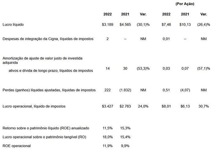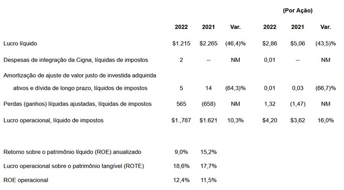 Para os seis meses encerrados em 30 de junho de 2022 e 2021, as despesas fiscais (deduções) relacionadas à tabela acima foram de US$(1) milhão e zero, respectivamente, para despesas de integração da Cigna; US$(6) milhões e US$(8) milhões para amortização de ajuste de valor justo de ativos investidos adquiridos e dívida de longo prazo; US$(62) milhões e US$149 milhões, respectivamente, para ganhos e perdas realizados líquidos ajustados; e US$ 717 milhões e US$ 514 milhões, respectivamente, para lucro operacional.