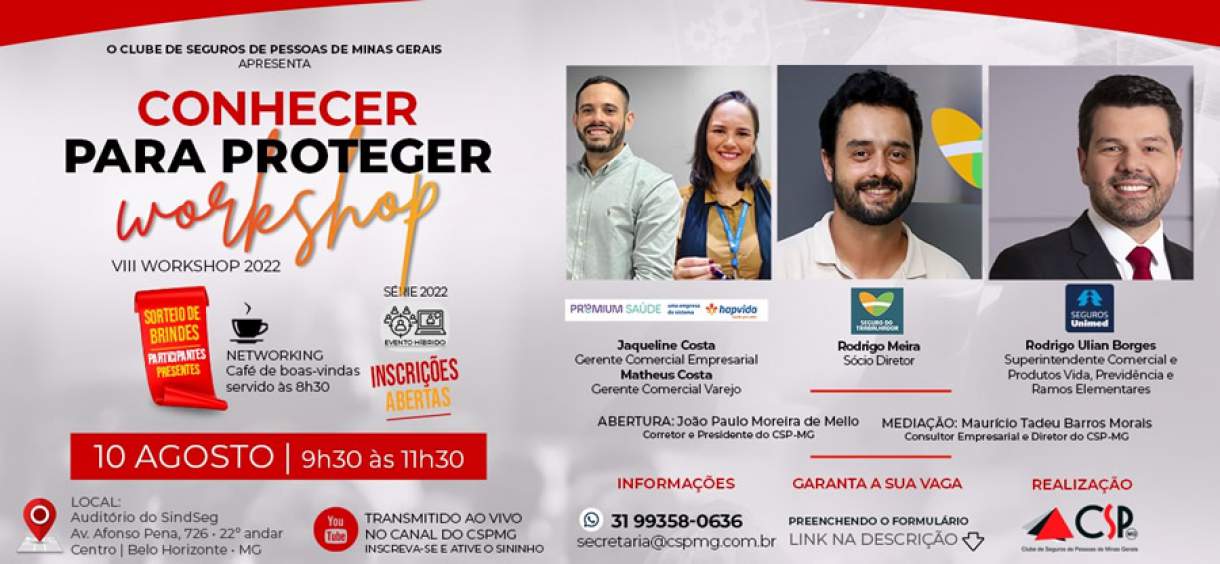 O Clube de Seguros de Pessoas de Minas Gerais (CSP-MG) promove, no dia 10 de agosto, o VIII Workshop Conhecer para Proteger, das 9h30 às 11h30, no auditório do SindSeg MG/GO/MT/DF.