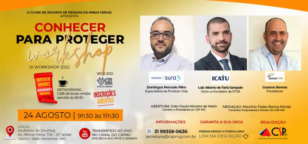 O IX Workshop Conhecer para Proteger, evento promovido pelo Clube de Seguros de Pessoas de Minas Gerais (CSP-MG), recebe, no dia 24 de agosto, as beneméritas Seguros Sura, Icatu e Sincor-MG, no auditório do SindSeg MG/GO/MT/DF. O encontro começa às 8h30 com um café da manhã oferecido aos convidados, entre eles corretores de seguros, consultores, representantes de assessorias e de seguradoras.