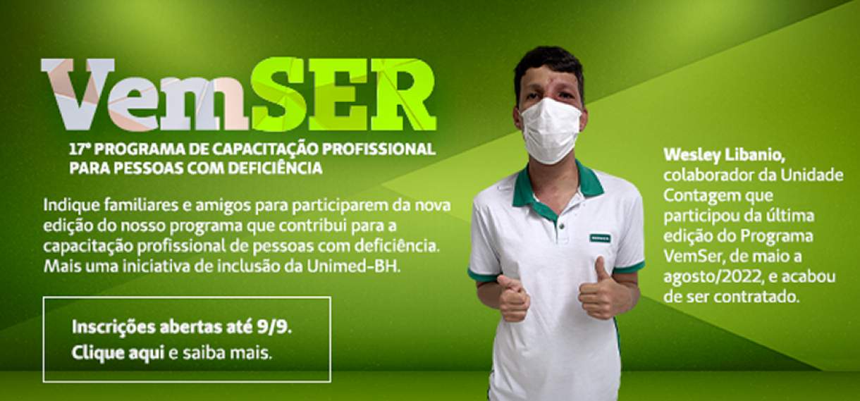 A Unimed-BH lança mais uma edição do VemSER - Programa de Capacitação Profissional para Pessoas com Deficiência. A iniciativa faz parte do movimento de inclusão da Cooperativa e é voltado para pessoas com deficiência maiores de 18 anos. Os interessados devem acessar o link (clique aqui) e se inscrever até 09 de setembro.