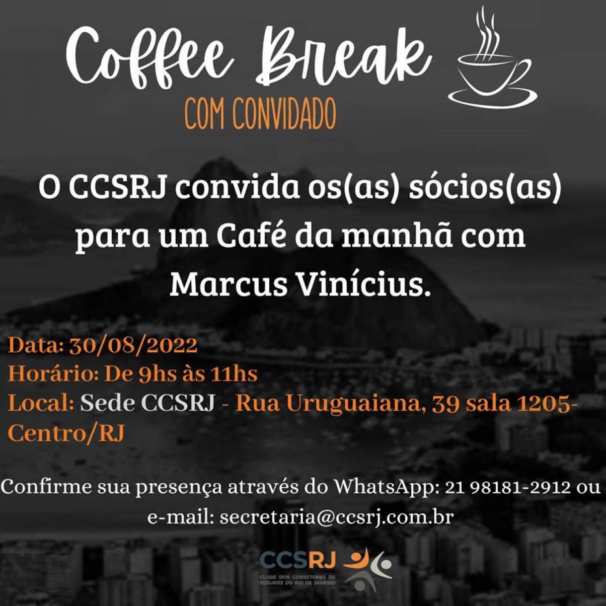 O Café da Manhã será no dia 30 de agosto, às 9h, na sede do Clube. “Será uma oportunidade única de trocarmos ideias sobre o mercado bem como apresentar propostas do nosso segmento para a pauta de Marcus Vinicius. A presença dos sócios é fundamental para essa troca de informações”, disse o presidente do Clube dos Corretores de Seguros do Rio de Janeiro (CCS-RJ), Luiz Mário Rutowitsch.