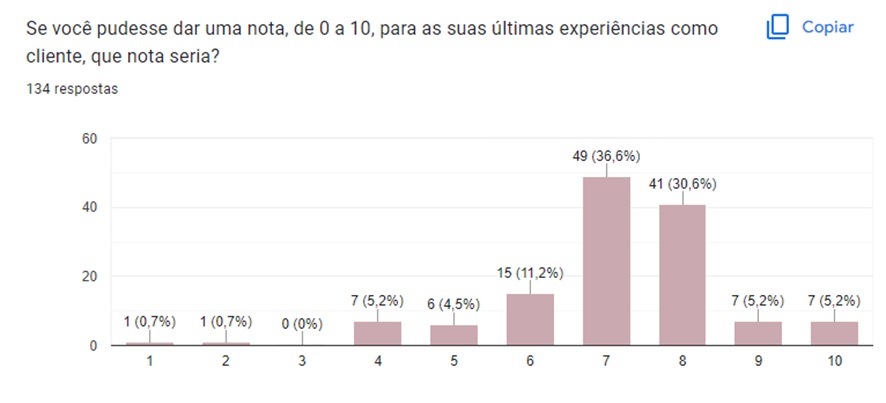 Ao avaliar de 0 a 10, as últimas experiências como cliente, 7 e 8 são as principais classificações.