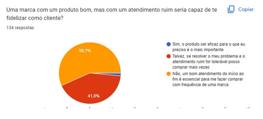 Já ao serem questionados se uma marca com produto bom, mas com atendimento ruim, seria capaz de fidelizar como cliente, grande parcela dos entrevistados aponta que um bom atendimento do início ao fim é essencial para fazer compra com frequência da marca.
