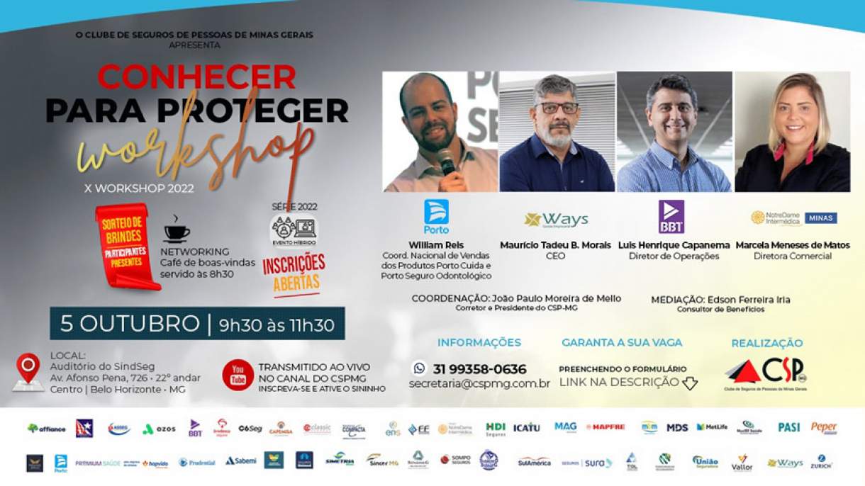 No dia 5 de outubro, o Clube de Seguros de Pessoas de Minas Gerais (CSP-MG) promove, das 9h30 às 11h30, o X Workshop Conhecer para Proteger com as beneméritas Porto, Ways Gestão Empresarial, Grupo BBT e NotreDame Intermédica Minas.