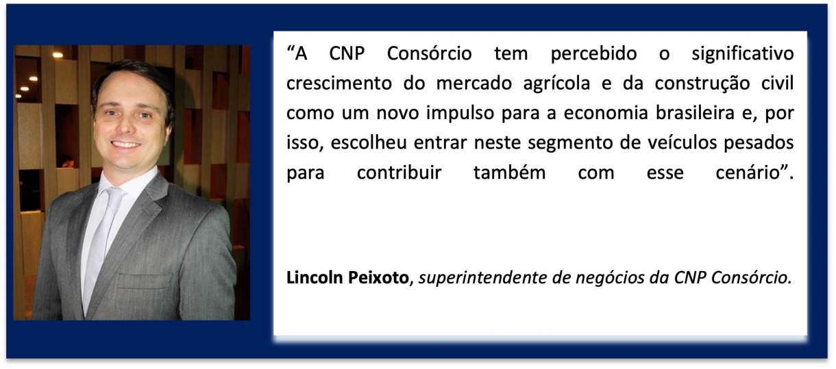 Atenta a um dos segmentos que mais cresce no país, a CNP Consórcio lança nesta quinta-feira, 13, o seu novo produto para Veículos Pesados. Com créditos entre R$ 250 mil e R$ 500 mil, este primeiro grupo terá prazo de 120 meses e parcelas lineares. Nos próximos grupos, o limite aumenta para R$ 1 milhão. O crédito poderá ser utilizado para adquirir máquinas e equipamentos agrícolas; ônibus, micro-ônibus e caminhões novos ou usados; máquinas e equipamentos para construção civil; e até mesmo placas fotovoltaicas.