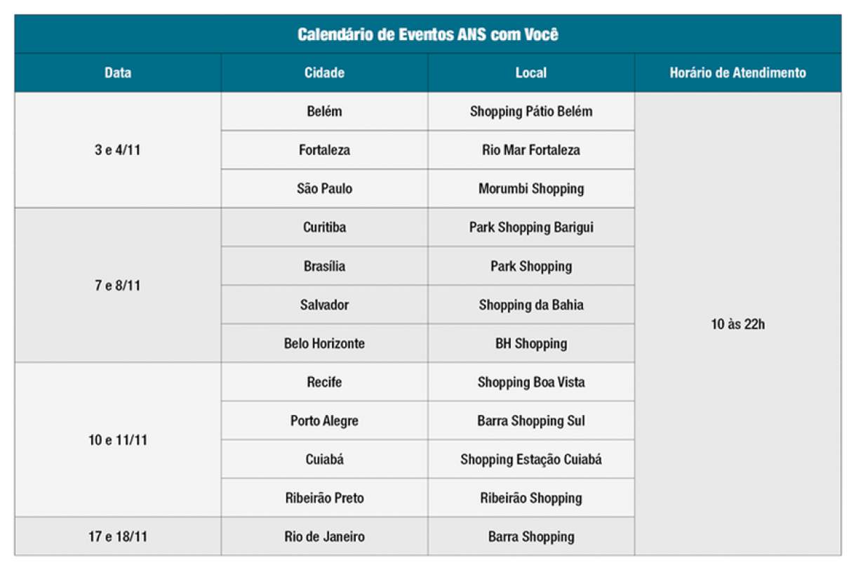 Nos dias 3 e 4/11 (quinta e sexta-feira), técnicos da Agência Nacional de Saúde Suplementar (ANS) estarão no Morumbi Shopping, das 10h às 22h, para esclarecer dúvidas de consumidores sobre planos de saúde.