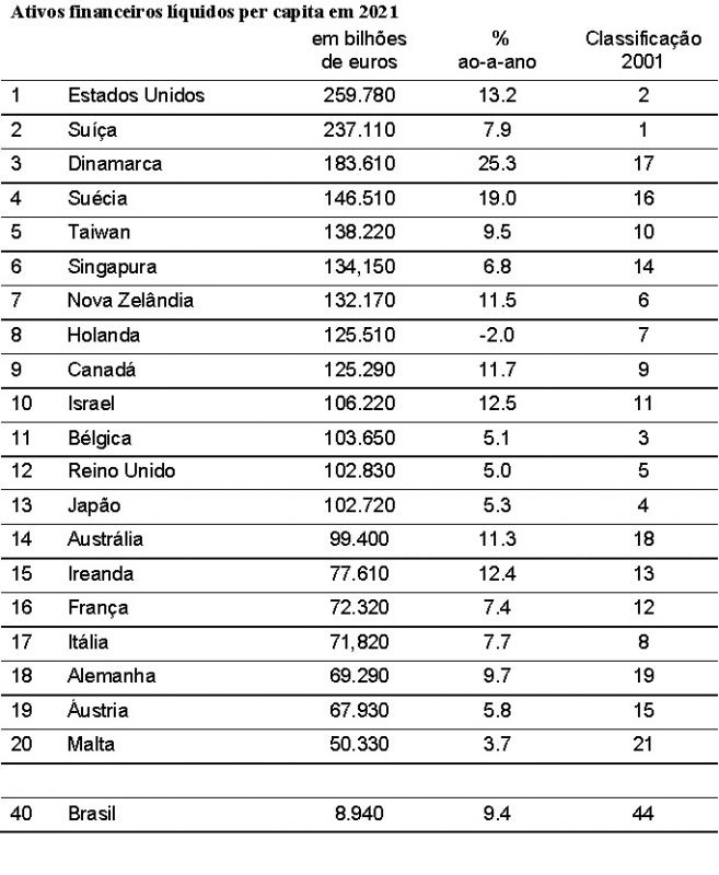 Os ativos financeiros brutos das famílias brasileiras aumentaram 9,4% em 2021, atingindo 2,6 trilhões de euros, o aumento mais modesto desde a crise financeira e bem abaixo da média de 15,6% dos últimos dez anos. A razão para esse desempenho abaixo do esperado se deve à inflação: a renda disponível das famílias brasileiras deu sinais de enfraquecimento alguns meses antes de começar a morder os bolsos dos mercados avançados. Como consequência, o Banco Central brasileiro começou a aumentar agressivamente as taxas de juros desde 2021. Como resultado, vimos os depósitos crescerem meros 2,4% no ano passado (comparado com o CAGR ou taxa de crescimento anual composto de 10,5% em dez anos). Os ativos de seguros e previdências privadas também sofreram, com um magro crescimento de 3,3% (contra uma média de longo prazo de 10,6%). Por outro lado, o crescimento dos títulos registrou robustos 12,6%. No entanto, o passivo registrou aumento de 21% no Brasil, colocando sobre as costas das famílias um ônus de 650 bilhões de euros – com uma taxa Selic de 13,8%, o serviço da dívida será um desafio no atual clima econômico. Mesmo assim, a riqueza líquida das famílias brasileiras cresceu 6%, atingindo 1,9 trilhão de euros. Com ativos financeiros líquidos per capita de 8.940 euros, o Brasil caiu um degrau, passando à 40ª posição no nosso ranking dos 20 países mais ricos (ativos financeiros per capita, ver tabela).