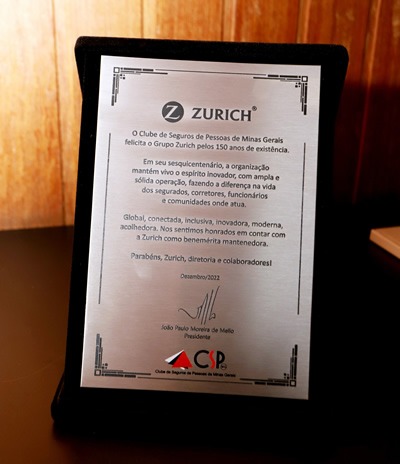 A diretoria-executiva do Clube de Seguros de Pessoas de Minas Gerais (CSP-MG) homenageou a Zurich pelos 150 anos de atuação. A seguradora é uma das beneméritas mantenedoras da entidade.