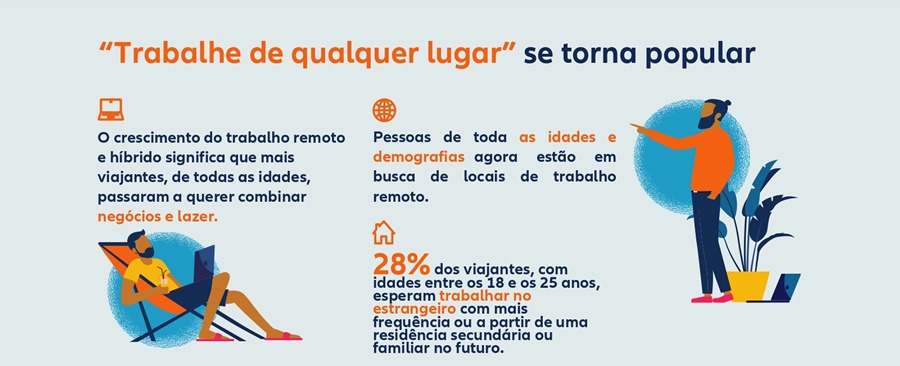 - O home office ganha dimensão: o crescimento do trabalho remoto e híbrido significa que mais viajantes, de todas as idades, estão combinando negócios com lazer, aumentando assim as viagens “Bleisure”, união entre as palavras business (negócios) e leisure (lazer). O relatório destaca também as adaptações exigidas pelo setor de turismo para dar resposta a essa procura – como, por exemplo, a necessidade de regulamentação atualizada, resolução de questões de domicílio fiscal e a necessidade de mais investimentos em destinos populares;