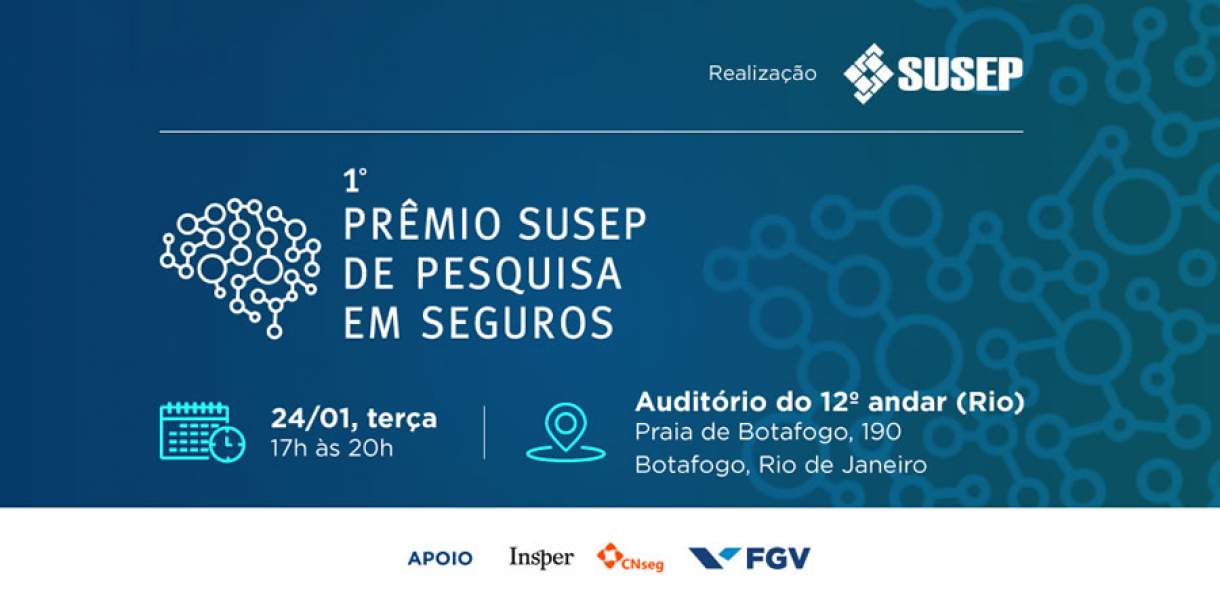 A cerimônia de entrega do 1º Prêmio SUSEP de Pesquisa em Seguros, que busca fomentar a produção acadêmica e a inovação no setor, será realizada no dia 24 de janeiro, às 17h, no Auditório da FGV, no Rio de Janeiro. A premiação foi desenvolvida pela Superintendência de Seguros Privados (SUSEP) em parceria com a Confederação Nacional das Seguradoras (CNseg), a Fundação Getulio Vargas (FGV), e o Instituto de Ensino e Pesquisa (Insper).