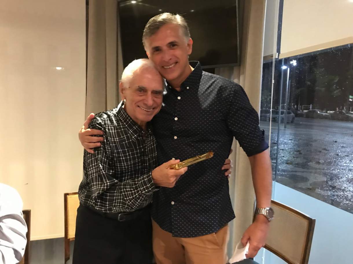 De pai para filho, esse é o segredo do sucesso do Clube da Bolinha. Há sete décadas gerações se renovam e se unem para celebrar a amizade construída no mercado de seguros. Na foto, Nilo Moraes, decano do Clube, entrega o brinde ao aniversariante do mês ao seu filho, Ricardo Moraes - Divulgação