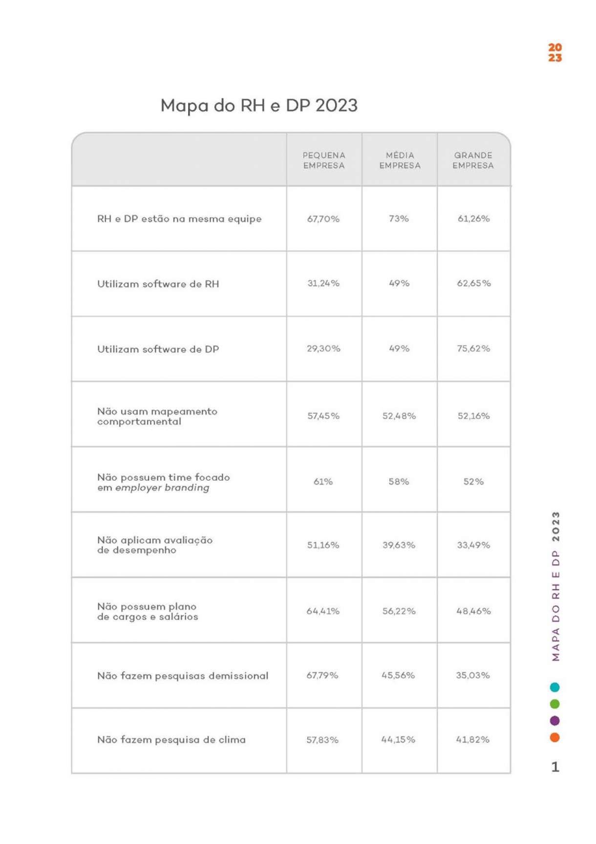 O relatório mostra, ainda, a falta de estrutura da gestão de pessoas, com times enxutos e a falta de tecnologia, o que se reflete em aspectos como tamanho das equipes e ausência de processos básicos automatizados. O baixo uso de softwares no RH e DP na gestão de pessoas é um dos pontos de destaque do estudo da Sólides: apenas 30% das pequenas empresas brasileiras (com até 49 funcionários) adotam sistemas desse tipo. Já nas médias (entre 50 e 199 funcionários), a participação sobe para 50%, e para 70%, nas grandes companhias (mais de 200 funcionários).