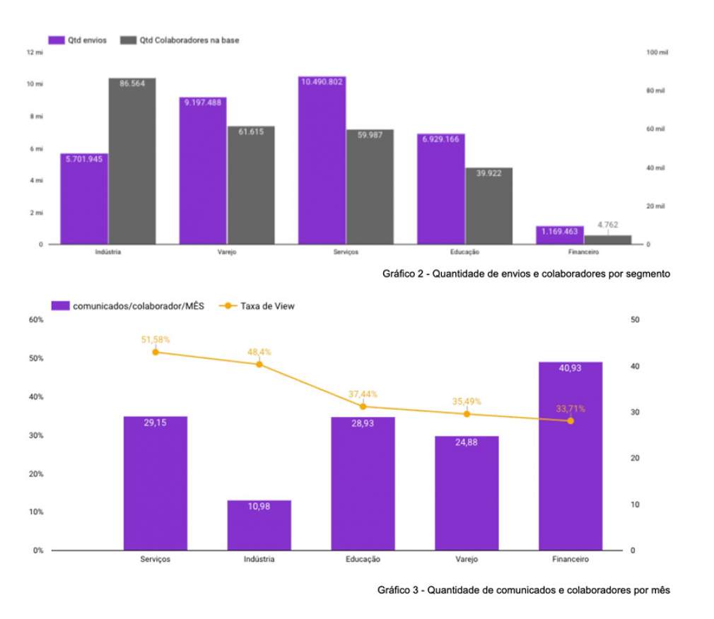 O levantamento aponta que o segmento de Serviços é o setor que demonstra maior aderência à Comunicação Interna, emitindo, em média, 10 milhões e 500 comunicados por mês, para uma base de aproximadamente 60 mil colaboradores cadastrados na plataforma, com taxa de abertura de 51.58%.