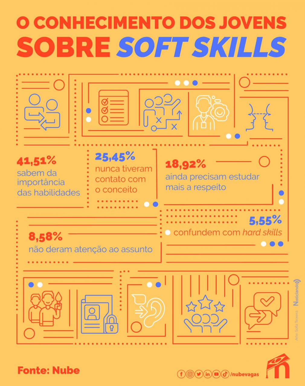 Nos últimos anos, novas competências ganharam valor no cotidiano empresarial. Nesse contexto, muitos gestores levam em consideração as questões socioemocionais na hora de contratar um novo membro para seu negócio. Com o intuito de entender mais sobre o tema, o Nube - Núcleo Brasileiro de Estágios fez uma pesquisa e perguntou: "você sabe o que são soft skills?”. Com dados coletados entre os dias 20 de fevereiro e 3 de março de 2023, o levantamento contou com a participação de 21.503 respondentes, de 15 a 27 anos de idade.