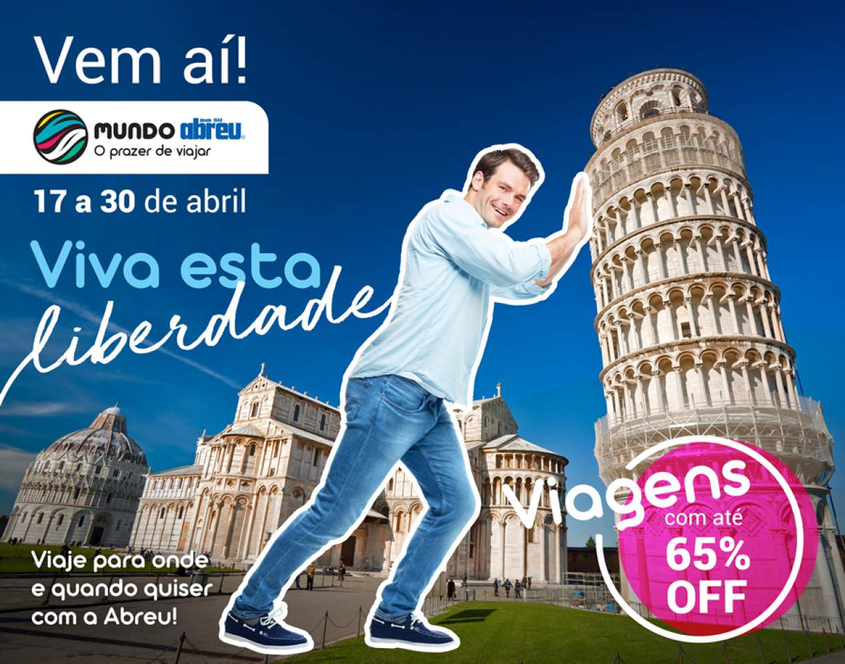 De 17 a 30 de abril, a Abreu realizará a terceira edição da campanha Mundo Abreu com descontos de até 65% em hospedagens nacionais e internacionais, pacotes, circuitos, entre outras vantagens. A promoção é realizada há quase 20 anos pela matriz da operadora em Portugal, e esta será a terceira edição no Brasil, consolidando a promoção também em território nacional.