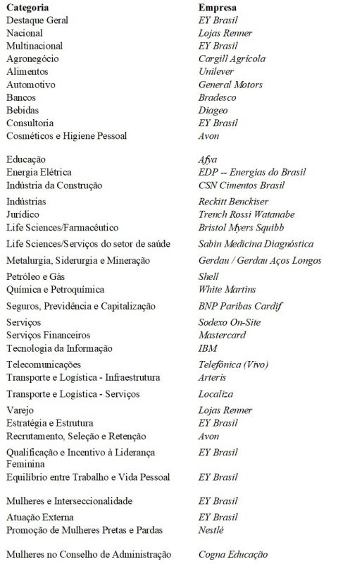 A consultoria EY foi a empresa que conquistou as melhores colocações na edição deste ano da relação que apresenta as companhias com melhores práticas para promover a ascensão feminina. A edição deste ano reconheceu 27 empresas em 36 categorias, compostas por: 25 segmentos de atividade, 6 eixos temáticos, o destaque entre as empresas multinacionais, o destaque entre as empresas nacionais, o destaque para promoção de mulheres negras, o destaque para mulheres em conselhos de administração e o destaque geral da pesquisa. Abaixo, confira as empresas que se destacaram na pesquisa: