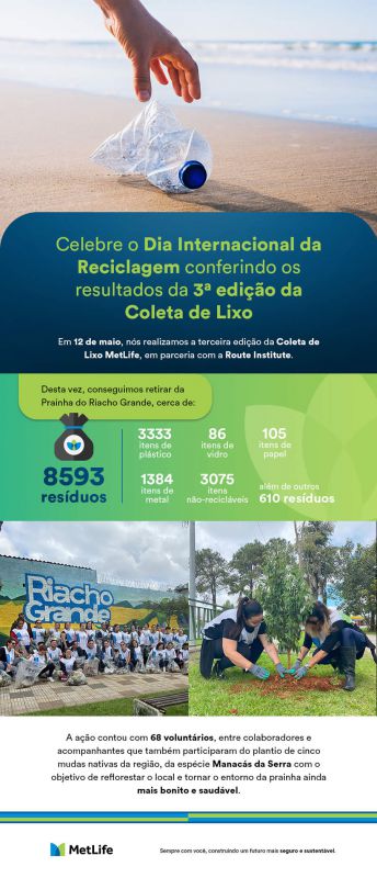 A MetLife, uma das principais empresas de serviços financeiros do mundo, e a Route Institute - organização da sociedade civil autônoma, sem fins lucrativos – realizaram na sexta-feira, dia 12, a terceira ação conjunta de coleta lixo, em São Paulo. Cerca de 70 voluntários, entre colaboradores da empresa, seus familiares e membros da ONG, participaram da ação de impacto social e sustentável que aconteceu na Prainha do Riacho Grande, na região metropolitana de São Paulo, um local turístico, na descida para a Baixada Santista, que faz parte do sistema Billings e abastece a região do ABC. No total, mais de 71 quilos foram recolhidos, o que equivale a 8.593 itens, sendo 3.075 de não recicláveis, 3.333 de plástico, 1.384 de metal, 105 de papel, 86 de vidro e 610 de outros itens que serão destinados para a Cooperativa MM reciclagem para reaproveitamento. Na ocasião, cinco mudas de Manacás da Serra foram plantadas ao redor da represa, almejando contribuir com o reflorestamento e a formação da flora local.
