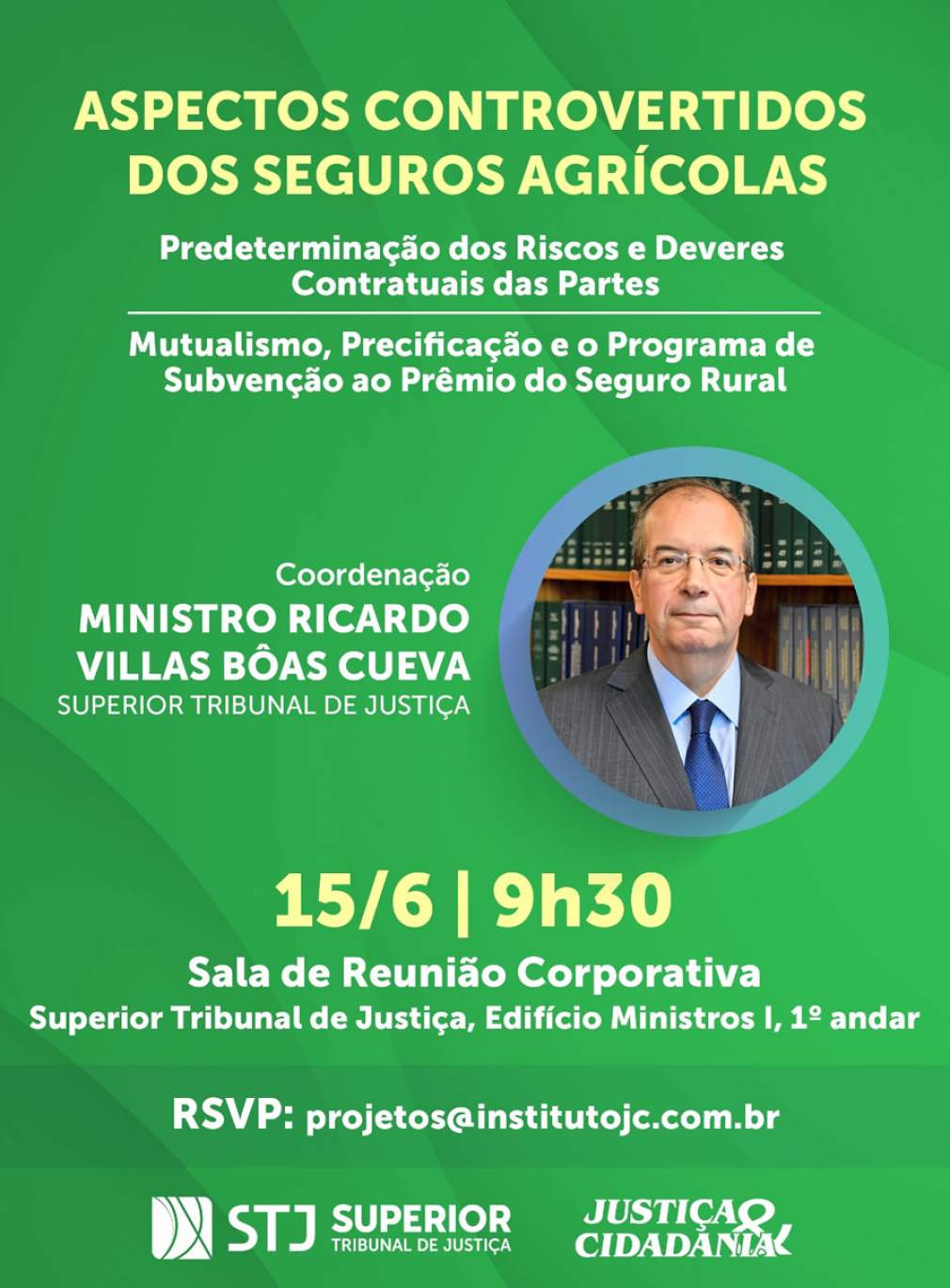 O Superior Tribunal de Justiça (STJ) e a Revista Justiça & Cidadania realizarão, em 15 de junho de 2023, das 9h às 12h30, o Seminário “Aspectos Controvertidos dos Seguros Agrícolas”, que acontecerá na Sala de Reunião Corporativa do Tribunal. Estão programados dois painéis, apresentados pelos ministros do STJ Ricardo Villas Bôas Cueva, coordenador do Seminário, e Antonio Carlos Ferreira, com a participação de especialistas nos temas a serem abordados.
