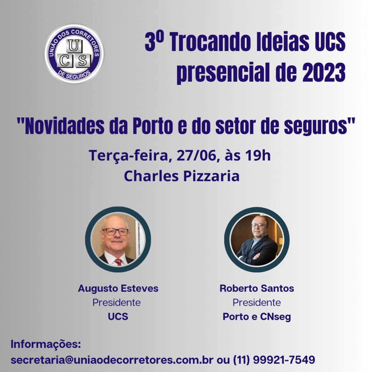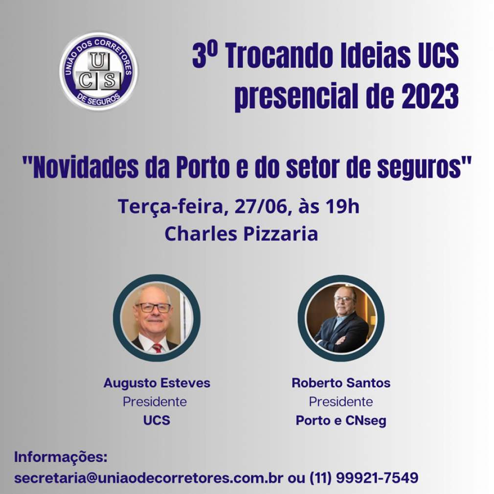 A União dos Corretores de Seguros (UCS) recebe o executivo Roberto Santos, presidente da seguradora Porto e presidente do Conselho da Confederação Nacional das Seguradoras (CNseg), em seu 3º Trocando Ideias de 2023. O evento acontece no dia 27 de junho (terça-feira), na Charles Pizzaria, na zona sul da capital paulista, aberto a todo o mercado de seguros, incluindo corretores associados ou não, seguradores, imprensa, e demais prestadores de serviços.