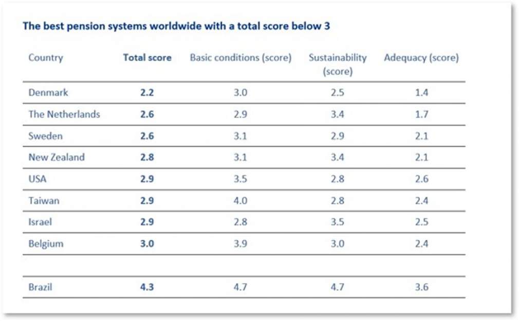 • O sistema previdenciário brasileiro obteve uma pontuação de 4,3 no Allianz Pension Index (API), indicando uma forte necessidade de mais reformas.
