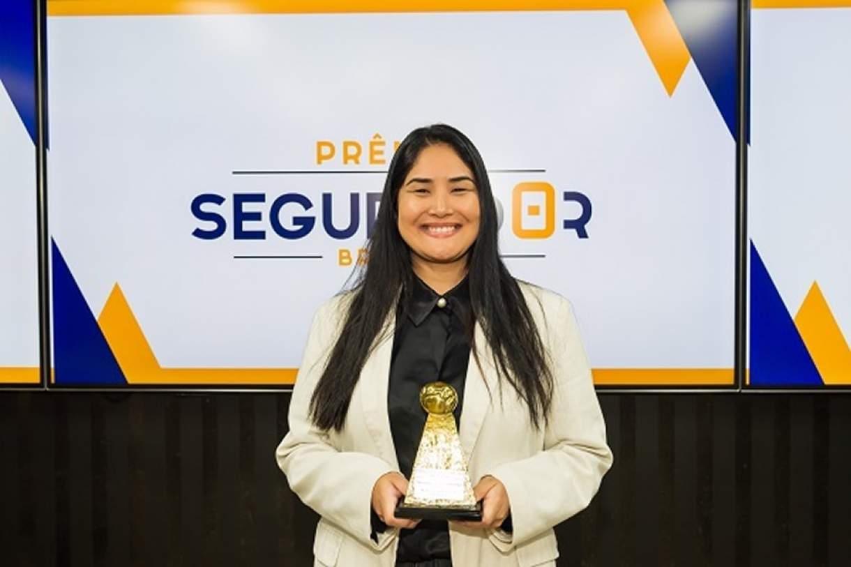 Paula Toguchi, diretora de produtos, recebendo o Prêmio Segurador Brasil