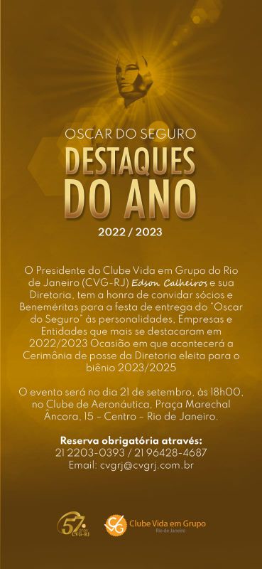 O Clube Vida em Grupo do Rio de Janeiro (CVG-RJ) tem o prazer de anunciar a realização da 47ª edição da premiação Destaques do Ano. O evento reunirá profissionais, lideranças e empresas do setor com a melhor performance no período 2022/2023, no dia 21 de setembro de 2023, para entrega do “Oscar do Seguro”, como o prêmio é conhecido pelo mercado.