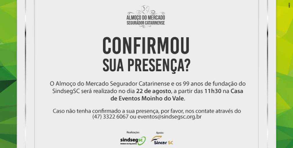 Os interessados em prestigiar este evento podem realizar a sua inscrição pelo portal de informações do SindsegSC (link: https://www.sindsegsc.org.br/novidades/agenda/7736/almoco_do_mercado_segurador_catarinense) ou confirmar presença pelo (47) 3322 6067. Contamos com a sua participação!