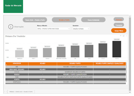 Em nosso radar, também identificamos as coberturas oferecidas em cada plano de venda, tais como: Roubo, Roubo / Furto, Roubo / Quebra, Roubo / Furto / Danos Líquidos, entre outras.