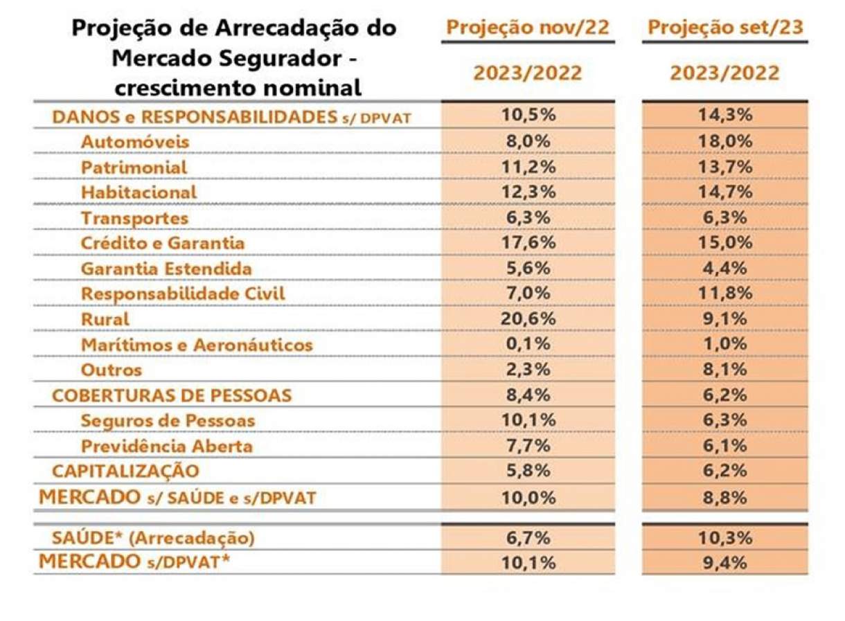 Para 2023, foi projetada uma alta de 6,3% no volume de arrecadação para os Seguros de Pessoas, com destaque para o seguro de Vida, que deverá encerrar o ano com crescimento de 10,9%; e de 6,2% para os Títulos de Capitalização. As projeções desenhadas pela Confederação Nacional das Seguradoras levam em consideração o cenário econômico atual e as expectativas com base nas informações do Relatório Focus do Banco Central do Brasil, bem como em modelos estatísticos.