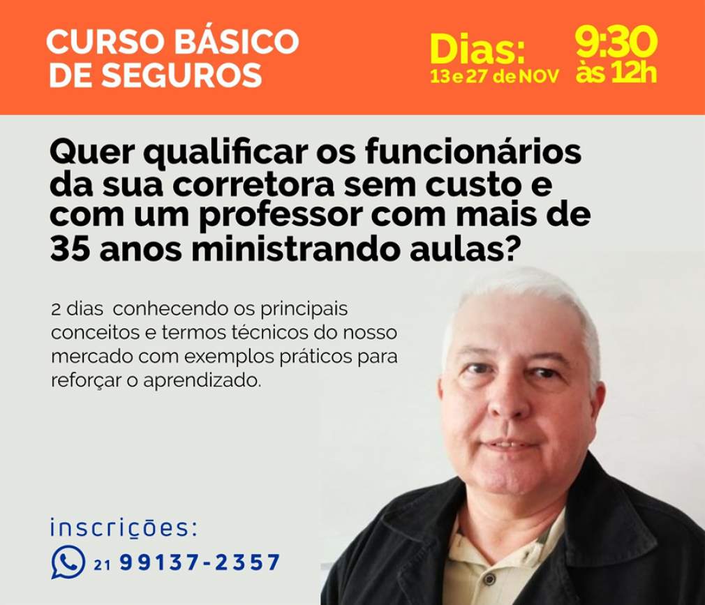 Nos dias 13 e 27 de novembro, a Kuantta Consultoria promove um curso básico de Seguros, ministrado pelo professor Marco Aurélio. Durante as aulas, será possível conhecer os termos técnicos do mercado de seguros, com exemplos práticos para reforçar o aprendizado.