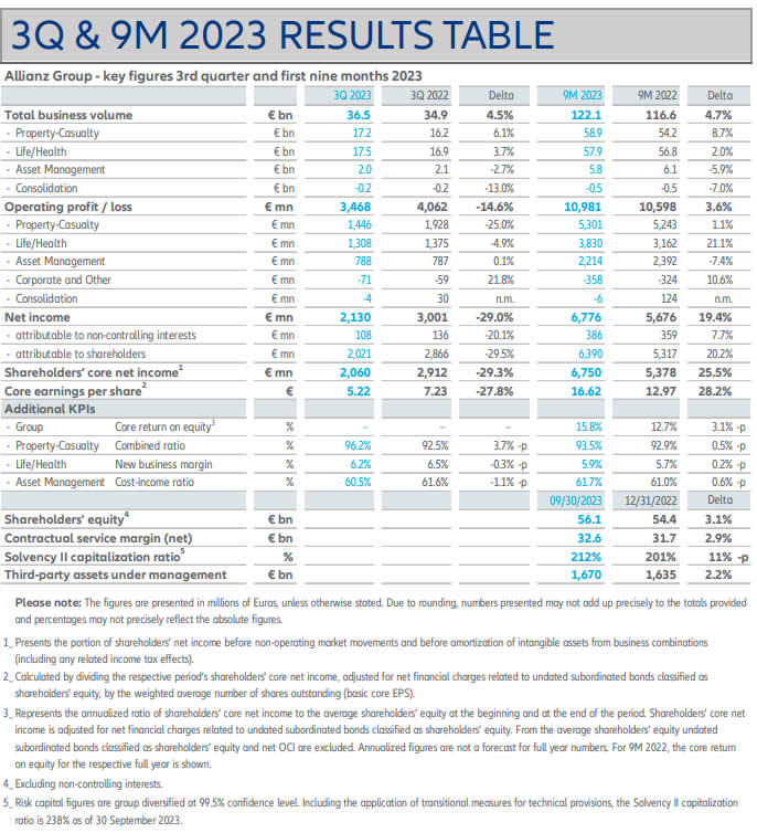 O lucro líquido básico (core net income) dos acionistas foi de 6,8 (9M 2022: 5,4) bilhões de euros devido ao lucro não operacional menor no período anterior, relacionado com a provisão do AllianzGI US Structured Alpha, e ao lucro operacional maior no período atual.